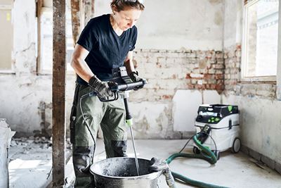 En omrörare är ett viktigt verktyg på alla byggarbetsplatser. Färger, murbruk, fästmassa, puts, flytspackel och spackelmassa – med en professionell omrörare blandas till och med trögflytande material enkelt och tillförlitligt. Tack vare den 2-växlade transmissionen med flexibel varvtalsinställning och den robusta, kraftfulla elmotorn kan rörhastigheten anpassas optimalt till varje material. Ytterligare ett plus: ErgoFix-höjdjusteringen gör att omrörarna från Festool kan ställas in för ergonomiskt arbete som avlastar ryggen.