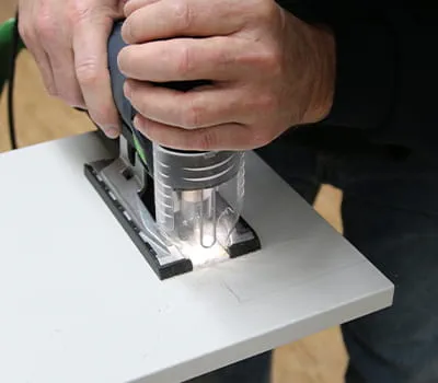 I nästa steg sågar man med sticksågen utmed markeringen. Sågens belysning gör att markeringen alltid syns tydligt. Se till att arbetsobjektet alltid sitter fast ordentligt.