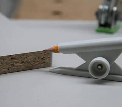 Det är praktiskt att använda en så kallad parallellritsare som man ställer in på skåpsidans materialtjocklek. Så brukar man göra med passlister som är förskjutna med frontens mått. Om passlisten placeras i linje med fronten ställer man normalt bara in halva materialtjockleken. Därefter sitter passlisten mitt på skåpsidan.