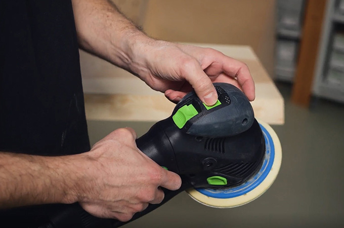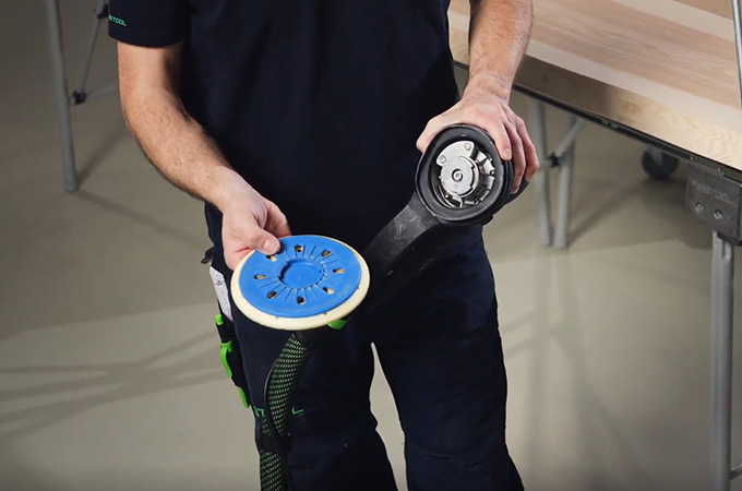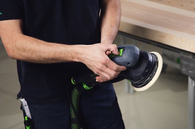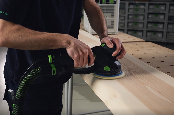 Vid finslipning måste de slipmärken som uppstår slipas bort så att de inte längre syns efter ytbehandlingen. För att göra detta lämnas P120-kornet först kvar på maskinen. ROTEX växlas till den excentriska rörelsen (finslipning). Slipmärkena från grovslipningen tas sedan bort. Även här utförs arbetet i en korsrörelse.
