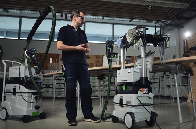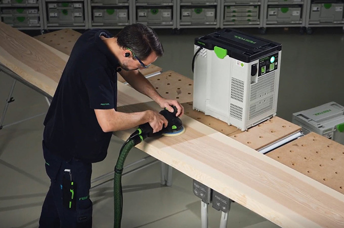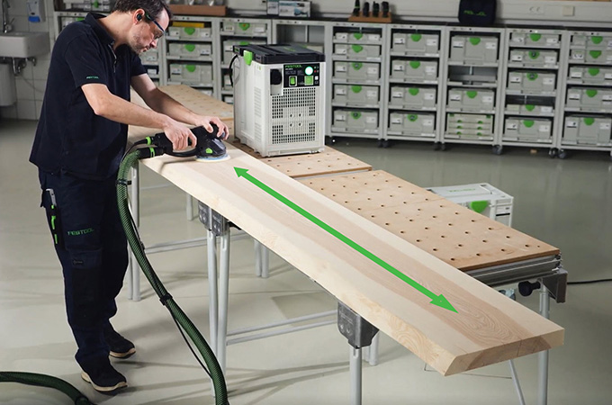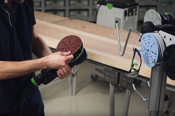 Hyvlade träytor har så kallade knivmärken, även kallade hyvelmärken, som orsakas av hyvelstål. Dessa måste slipas före ytbeläggningen. Det ger en jämnare och mer homogen yta och gör också att ytbehandlingen får bättre fäste eller tränger in bättre i träet. Om du inte har en stor stationär slipmaskin kan du utföra detta arbetsmoment med handslipmaskiner. ROTEX är idealisk för detta eftersom den kombinerar grovslipning och excenterslipning i en och samma maskin. Eftersom detta arbete huvudsakligen utförs i verkstaden är det en fördel om arbetsplatsen är inredd därefter. Därför vill vi här ta en kort titt på våra systemtillbehör.