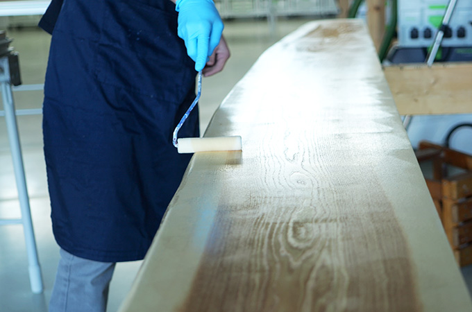 För träslag som ek är det lämpligt att vattna ytan före den slutliga slipningen. Det gör du genom att fukta ytan med en fuktig svamp eller trasa. Träfibrerna reser sig och kan sedan jämnas ut med en sista finslipning efter torkning. Vid mellanslipning efter den första ytbehandlingen är dessa fibrer redan avskurna och ytan blir ännu slätare. Blötläggning är också en stor fördel när man arbetar med betser.