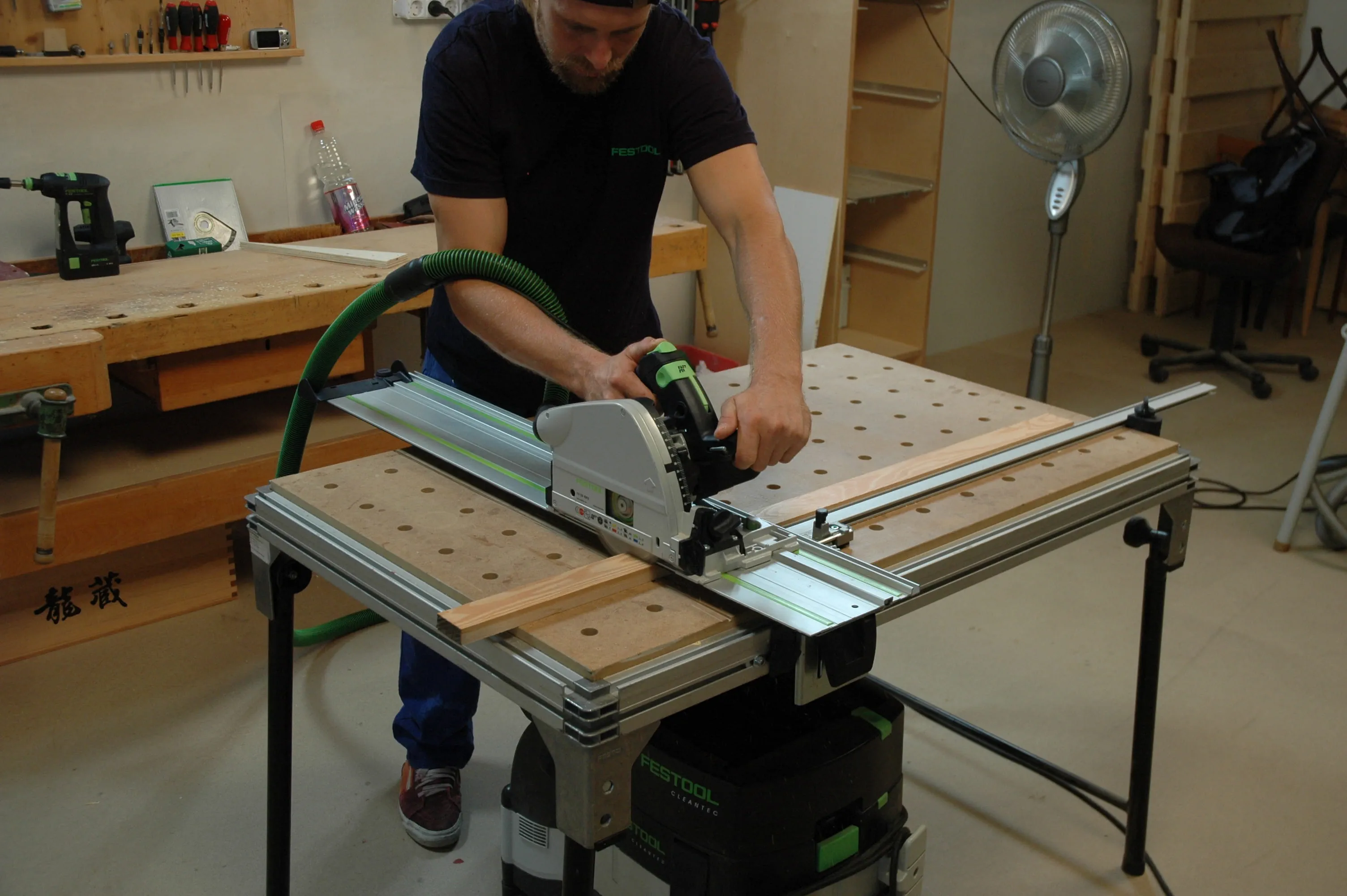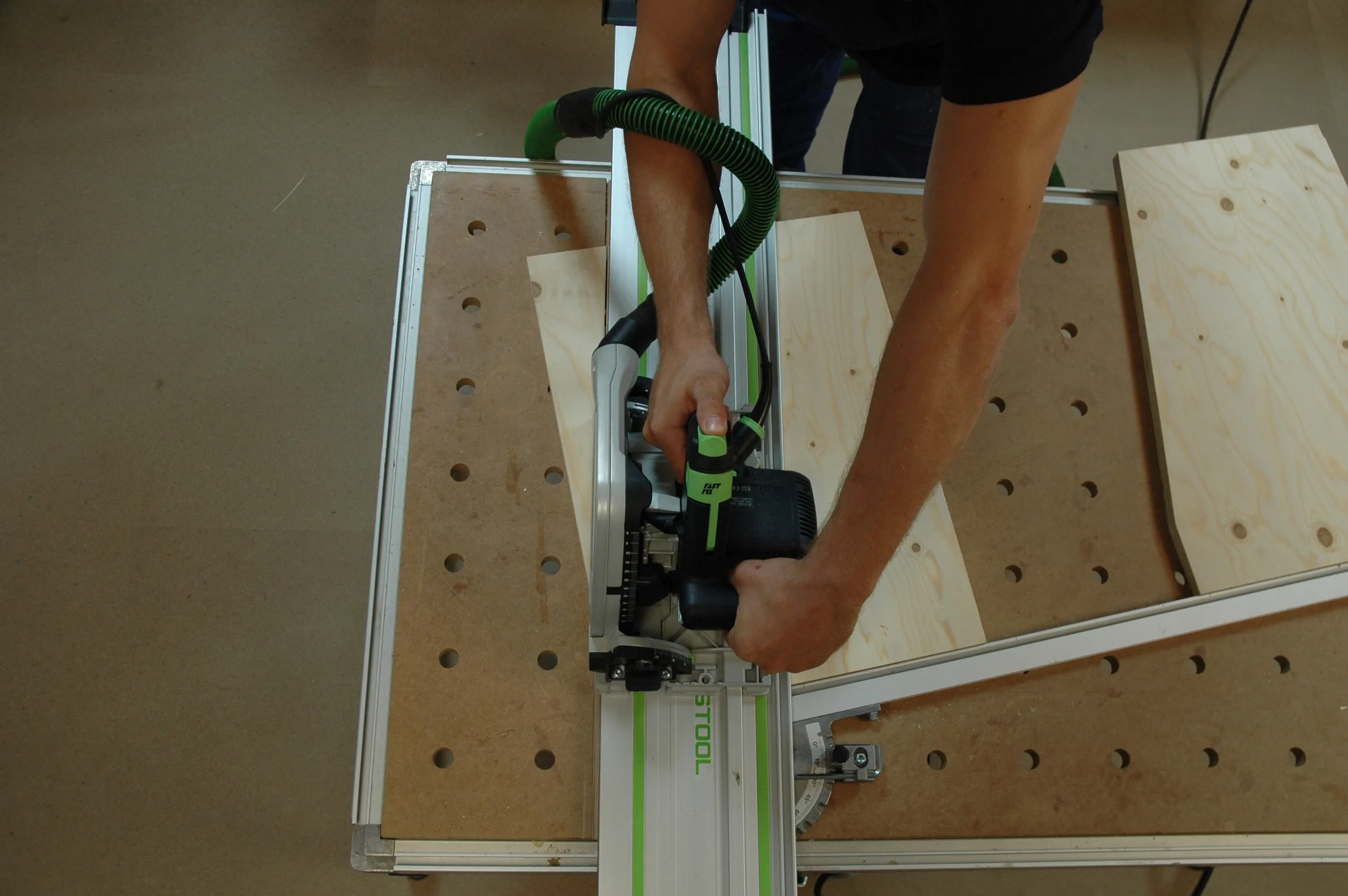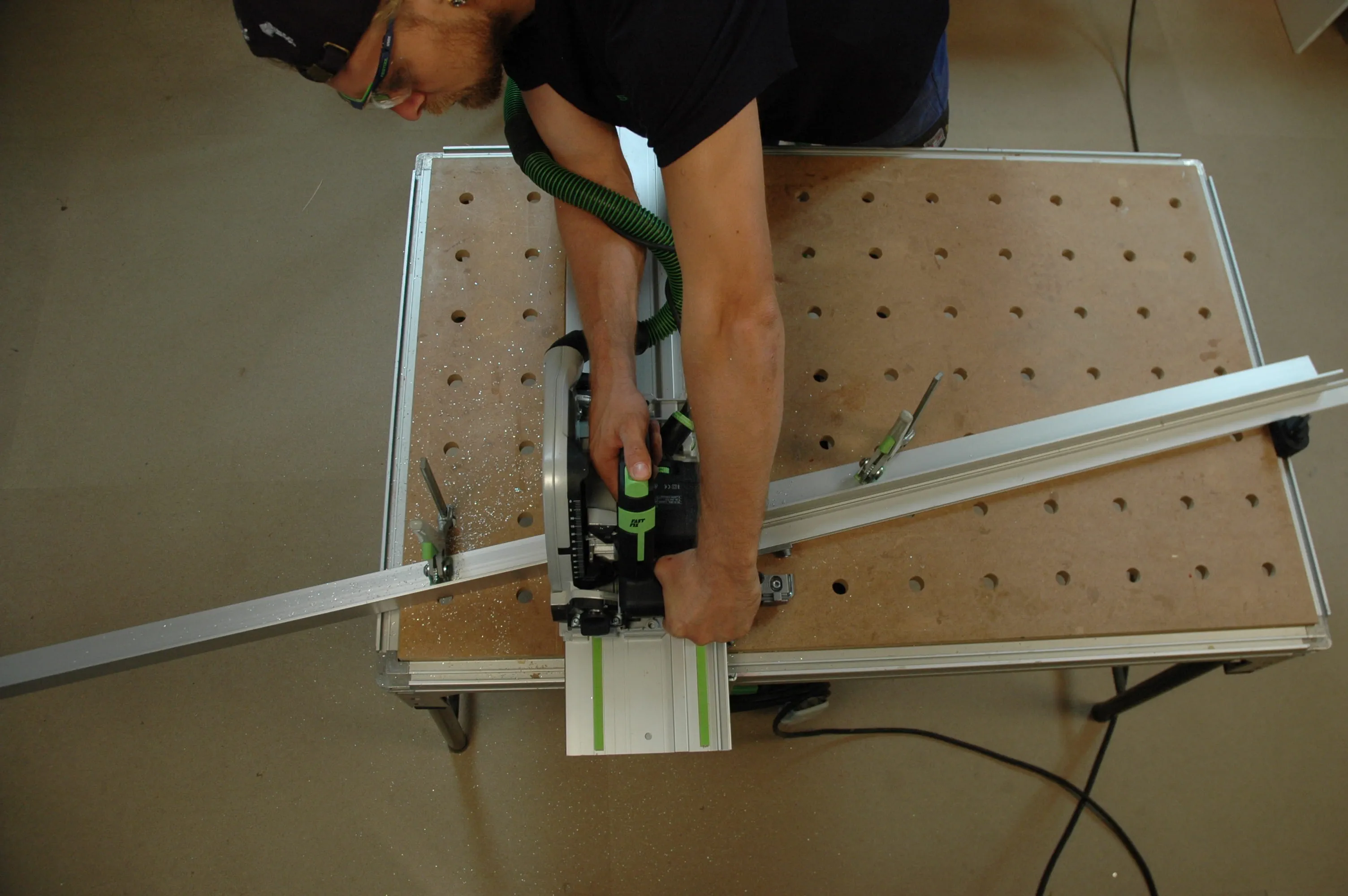 Med multifunktionsbordet som visas på bilden kan du snedställa anslagsskenan och spänna fast arbetsobjektet på bordet. På samma sätt kan du även såga aluminiumprofilerna till benen.