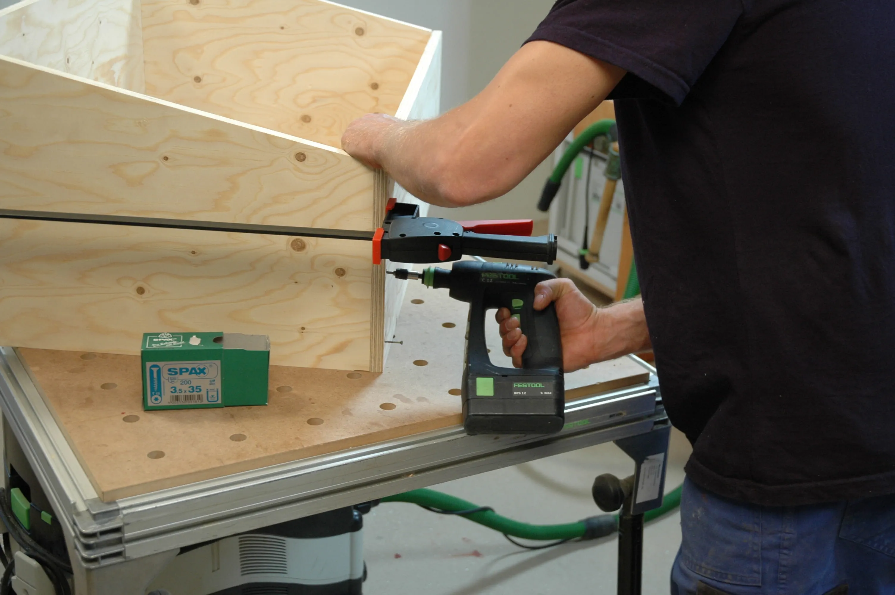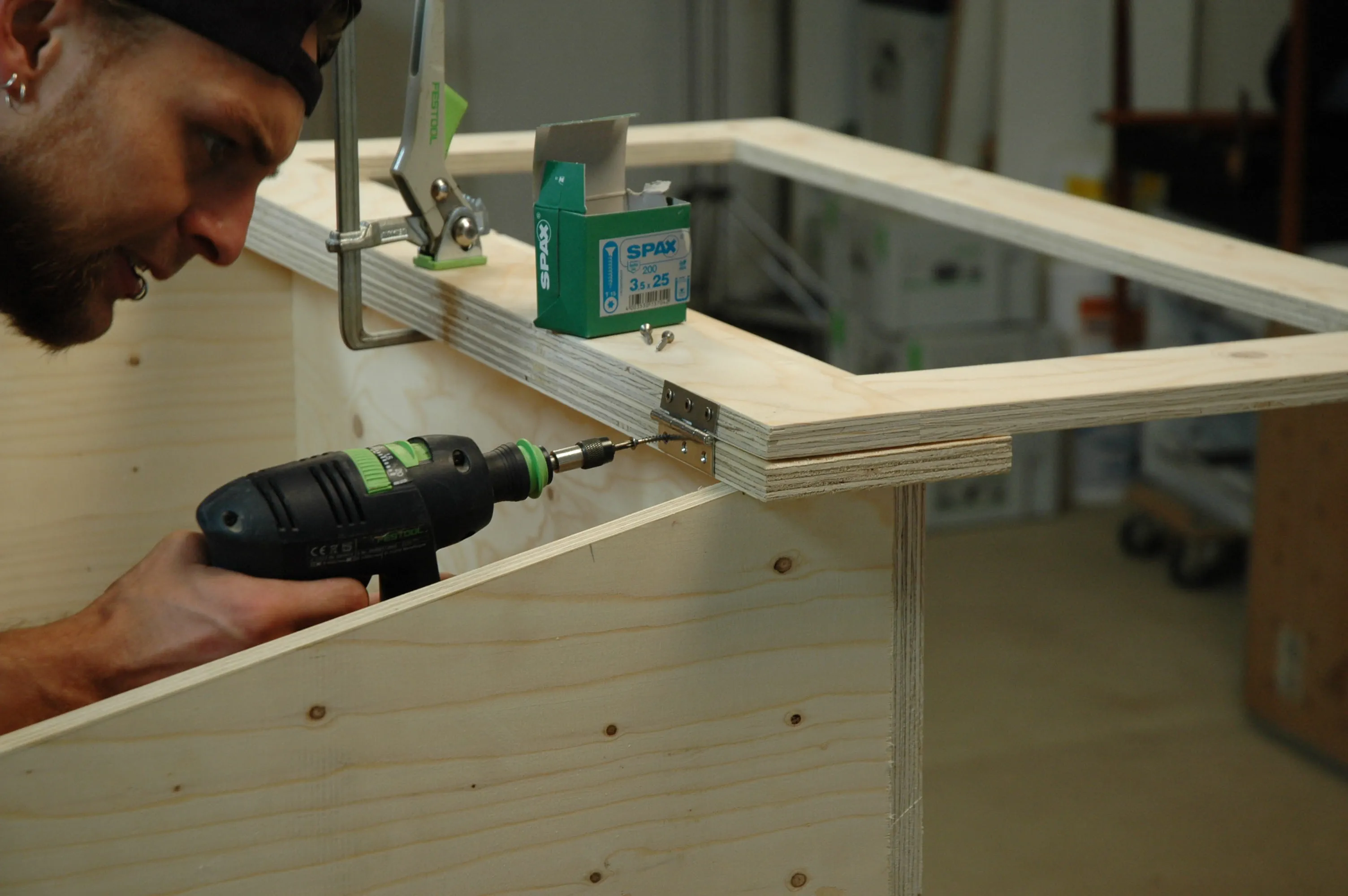 Förborra hålen D = 3,5 mm för Spax-skruvarna (3,5 x 35) i fram- och bakstycket (pos. 1 + 2). Spänn ihop de fyra brädorna som bildar lådan med tvingar, justera och skruva ihop dem med varandra.