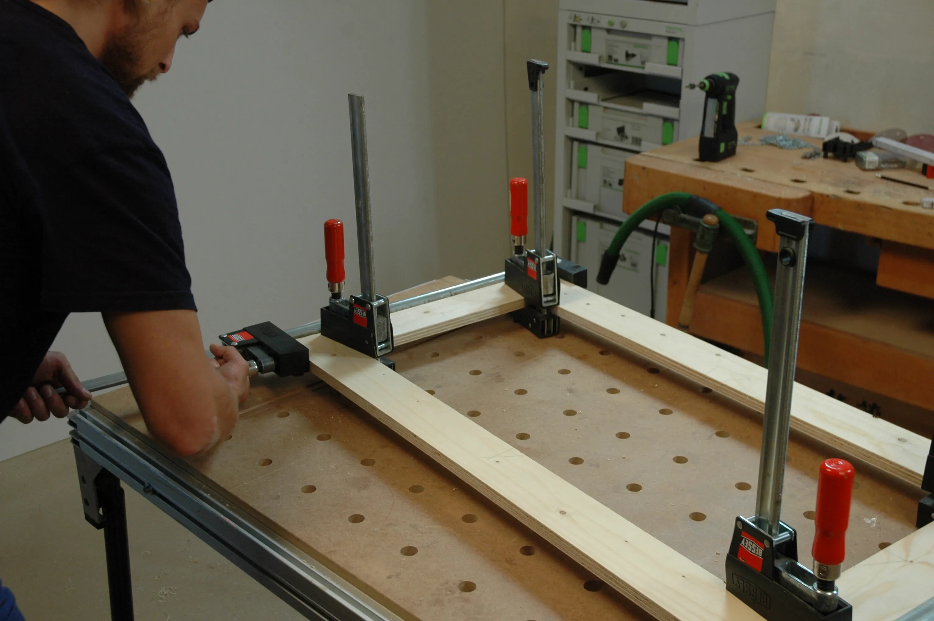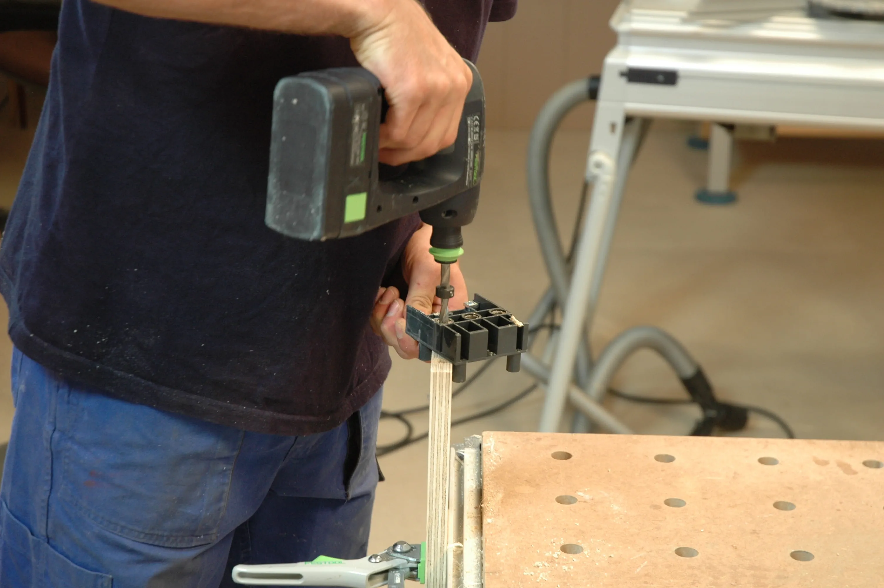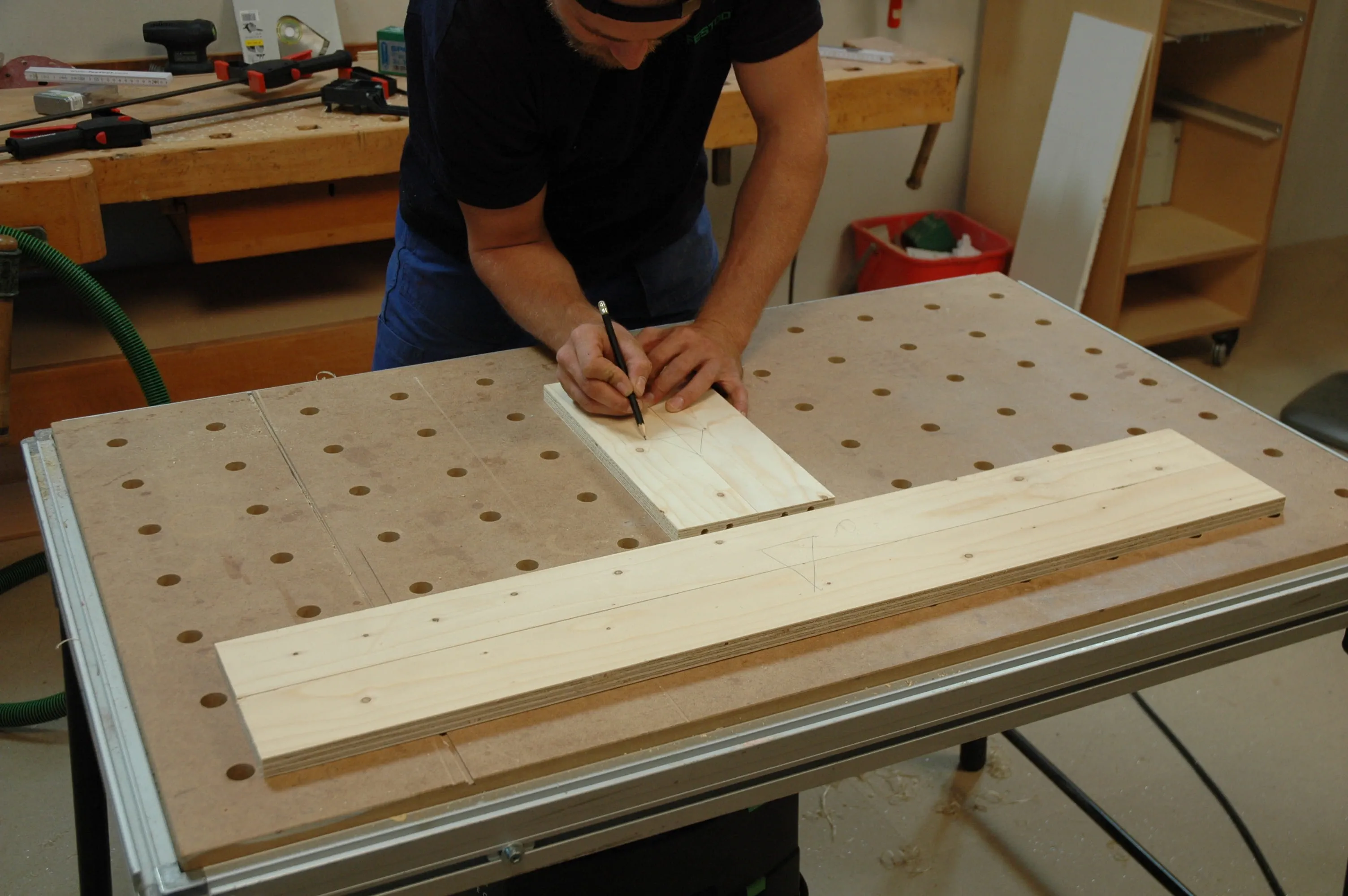 Hålen ska sitta ca 10 mm från kanten och så i mitten av skivan som möjligt. Sätt i markeringsstift i hålen och överför på så sätt mittpunkterna till de långa ramdelarna (pos. 5). Brädan som spänts fast på bordet fungerar som anslag. Borra även här hålen med samma borrdjup.