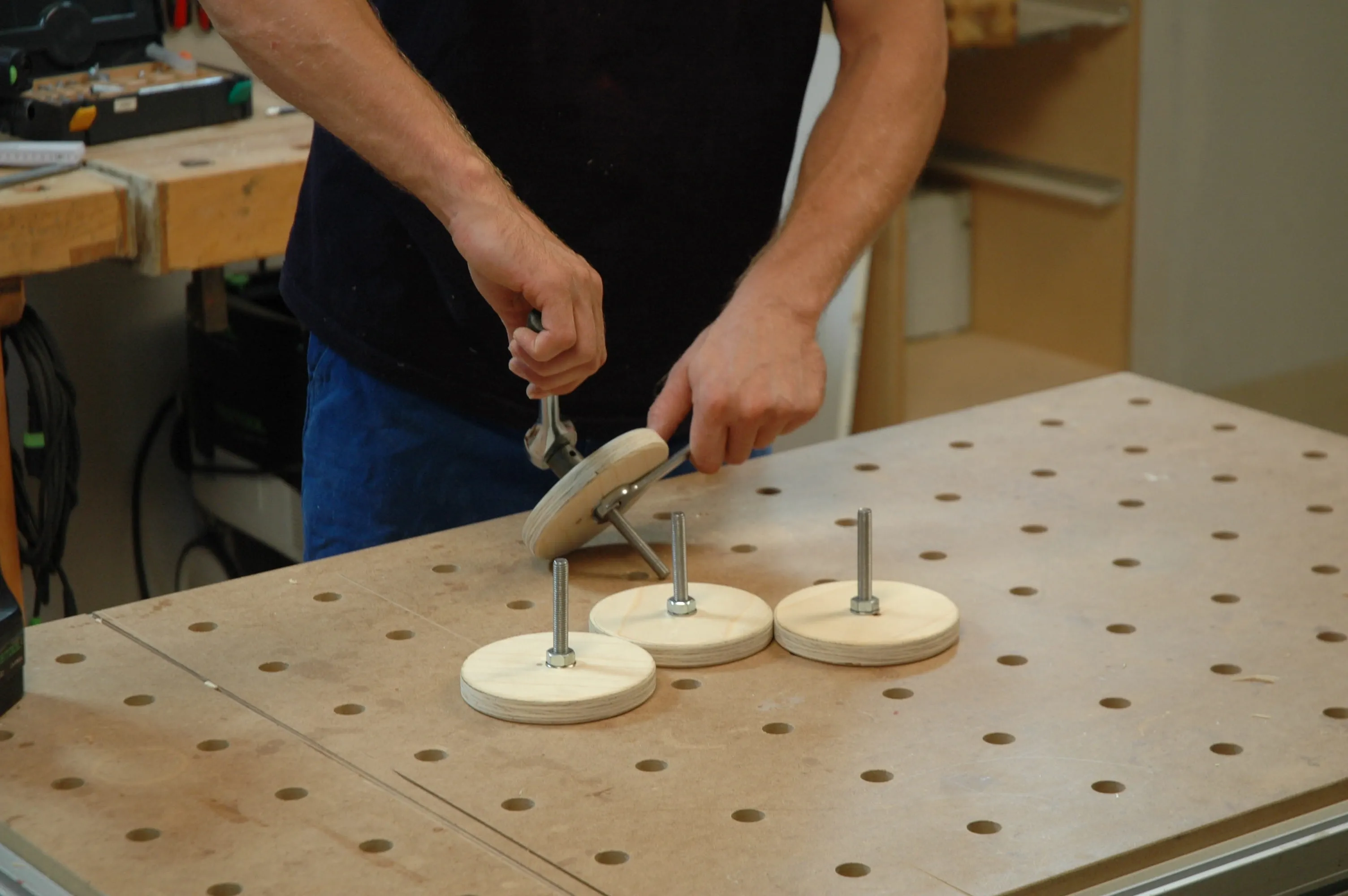 För de inställbara fötterna sågar du ut runda skivor (pos. 16) av plywood med en sticksåg. Jämna till kanterna (grada av) med en handslipkloss. Borra 30 mm-hål i skivornas undersida. Borrdjupet ska motsvara huvudet på en maskinskruv (M 10 x 80) och en underläggsbricka.