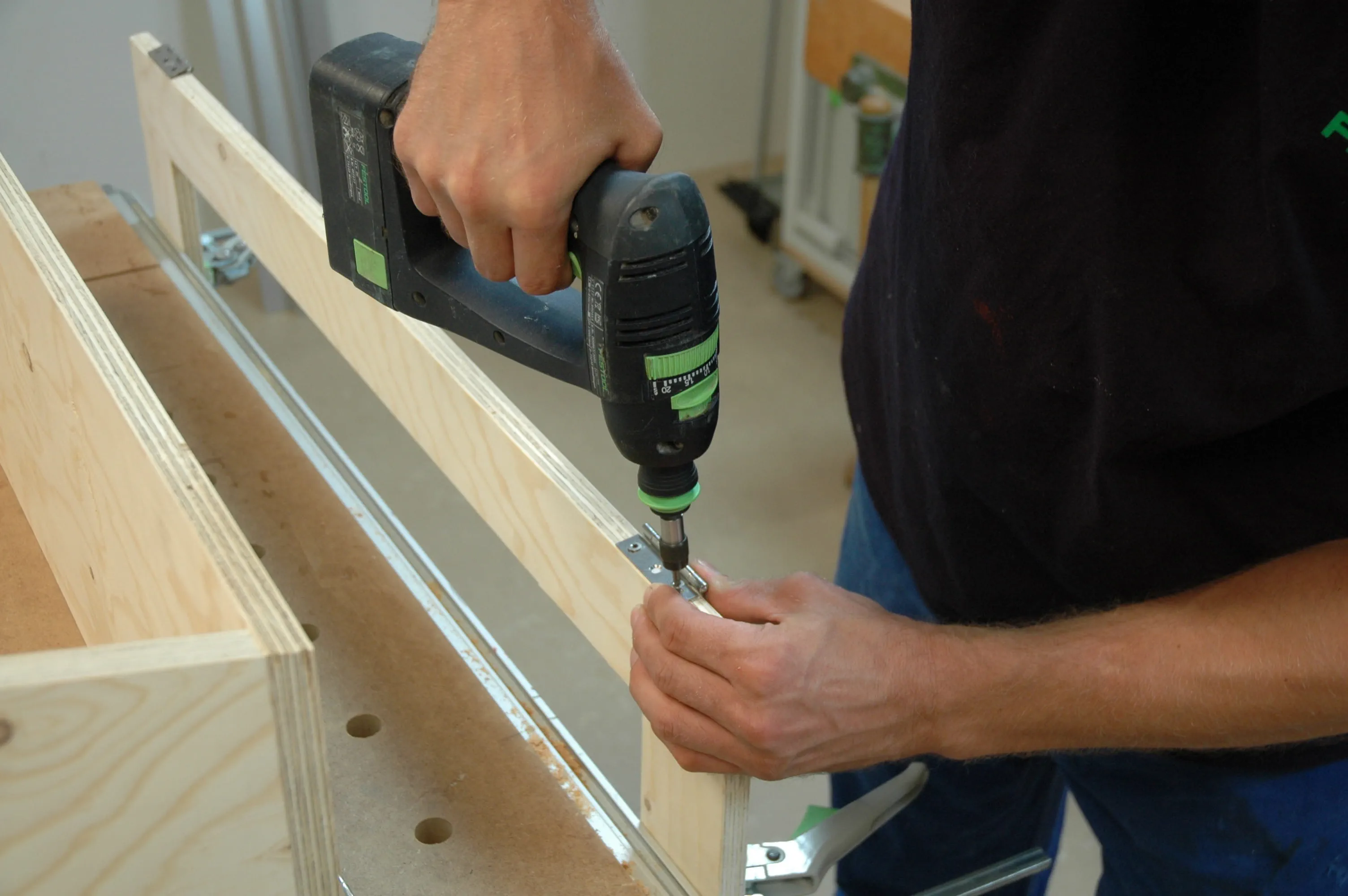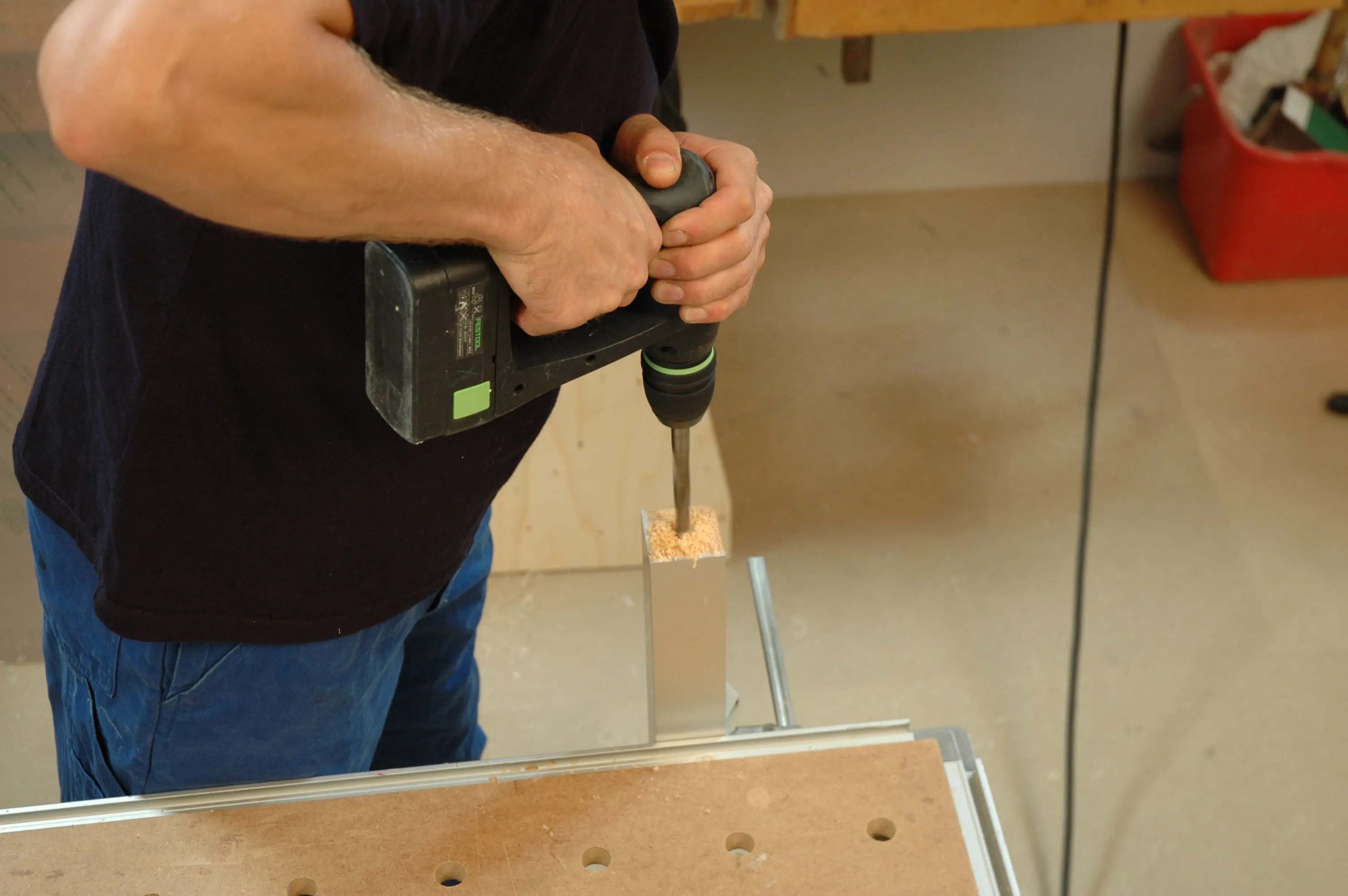 Borrdjupet ska motsvara längden på en maskinskruv. Borrdiametern beror på mutterns typ och tillverkare. Om du använder islagsmuttrarna som är lättare att bearbeta ska du genomborra dem två gånger när de har slagits i och fixera dem med Spax-skruv 3,5 x 35 så att de inte kan glida ur.